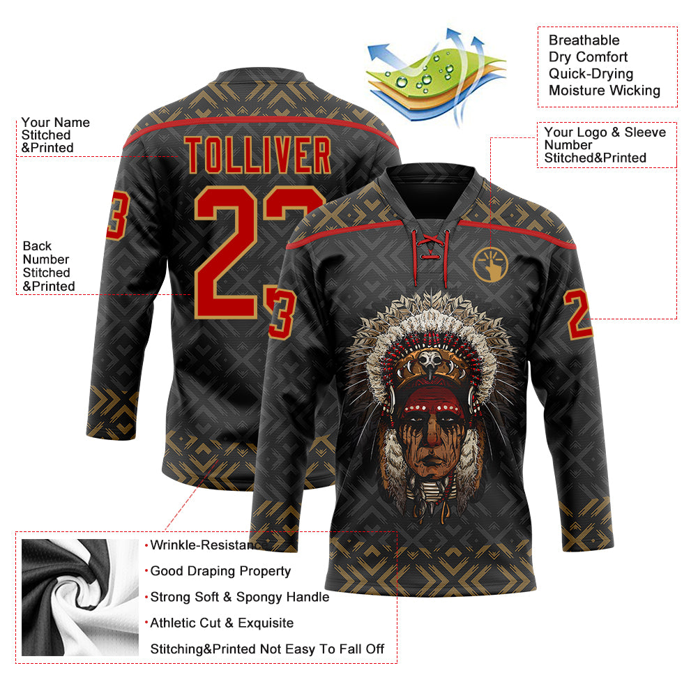 Custom Black Red-Old Gold 3D Pattern Native Americans Tribal Indigenous People Hockey Lace Neck Jersey