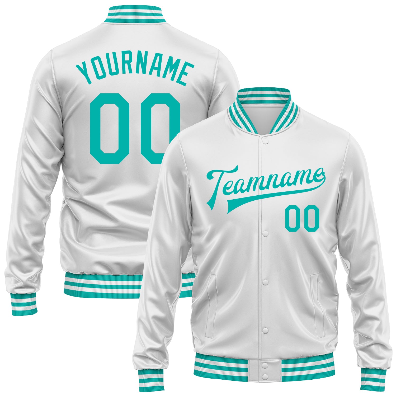 Custom White Aqua Bomber Full-Snap Varsity Faux Leather Letterman Jacket