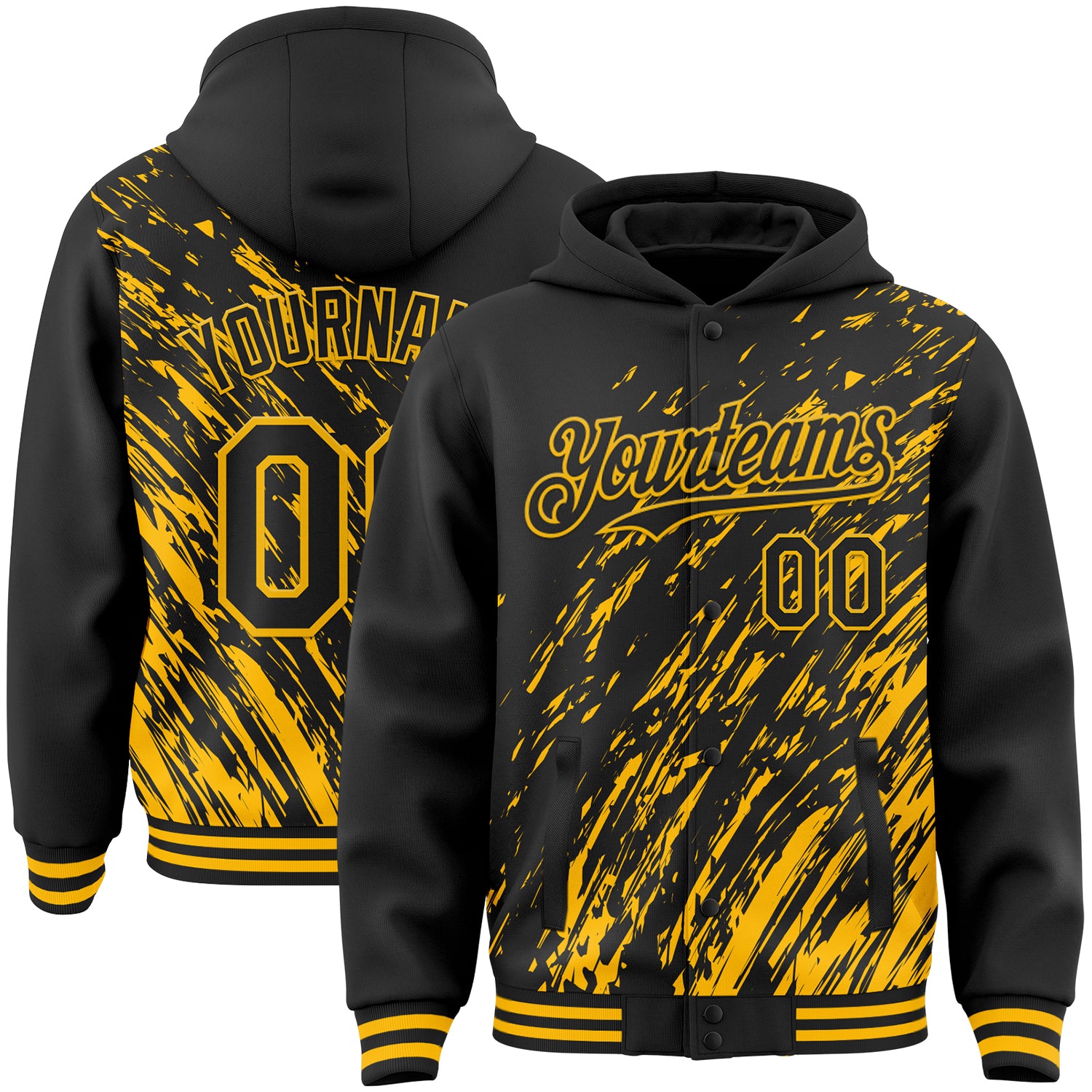 Custom Black Black-Gold 3D Pattern Design Bomber Full-Snap Varsity Letterman Hoodie Jacket