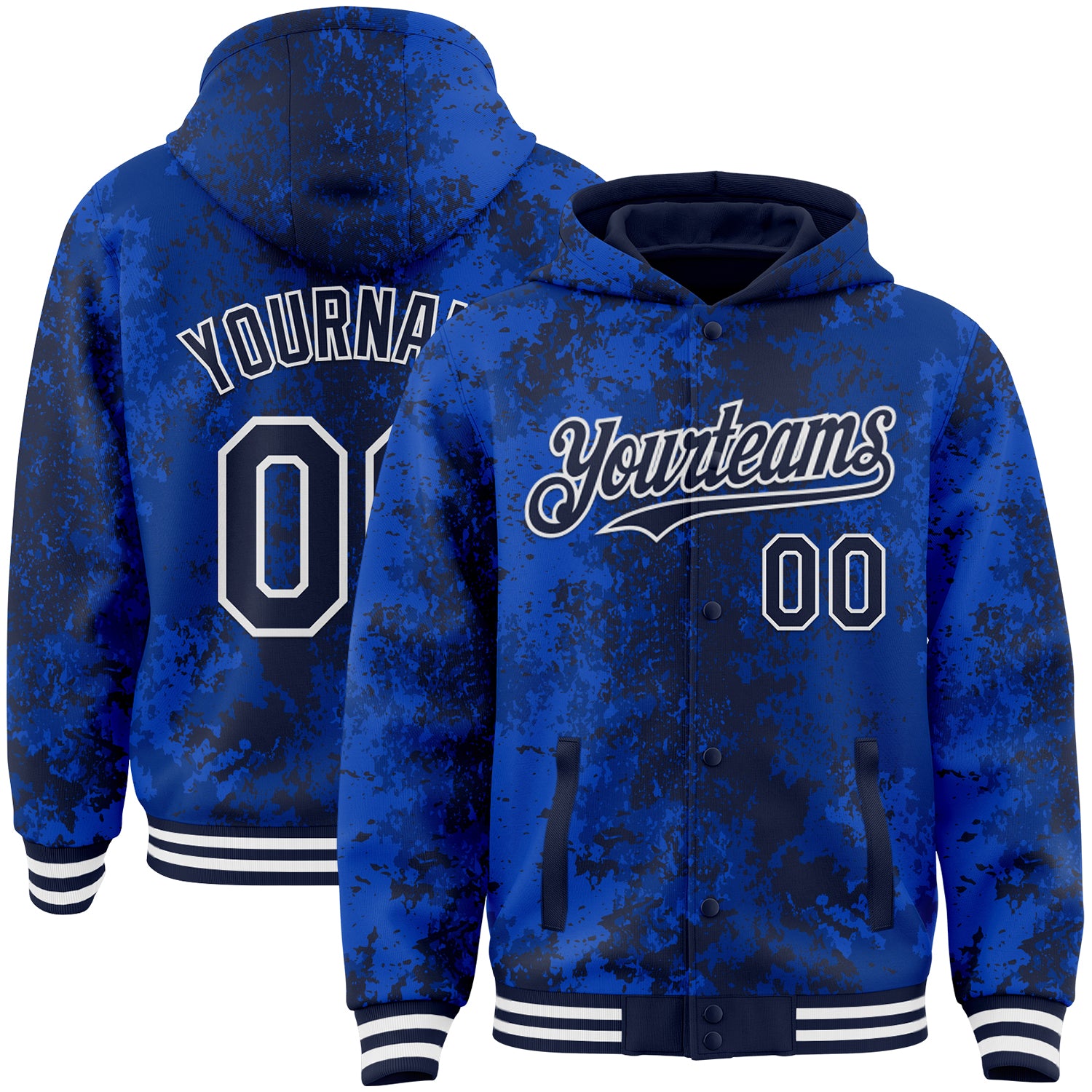 Custom Royal Navy-White 3D Pattern Design Bomber Full-Snap Varsity Letterman Hoodie Jacket