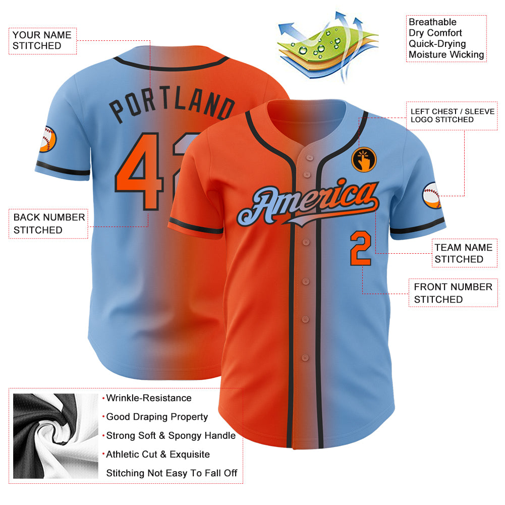 Custom Light Blue Orange-Black Authentic Gradient Fashion Baseball Jersey