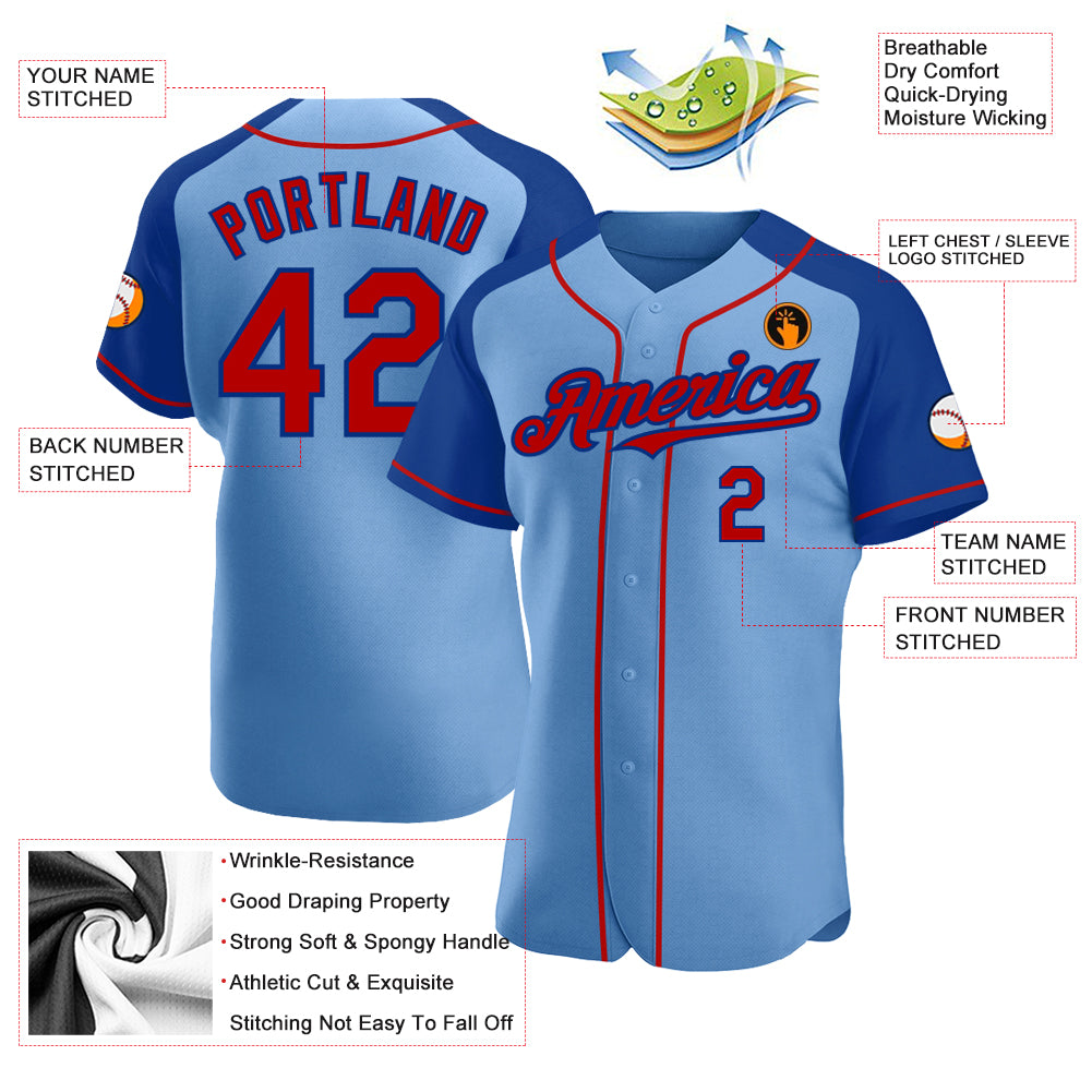 Custom Light Blue Red-Royal Authentic Raglan Sleeves Baseball Jersey