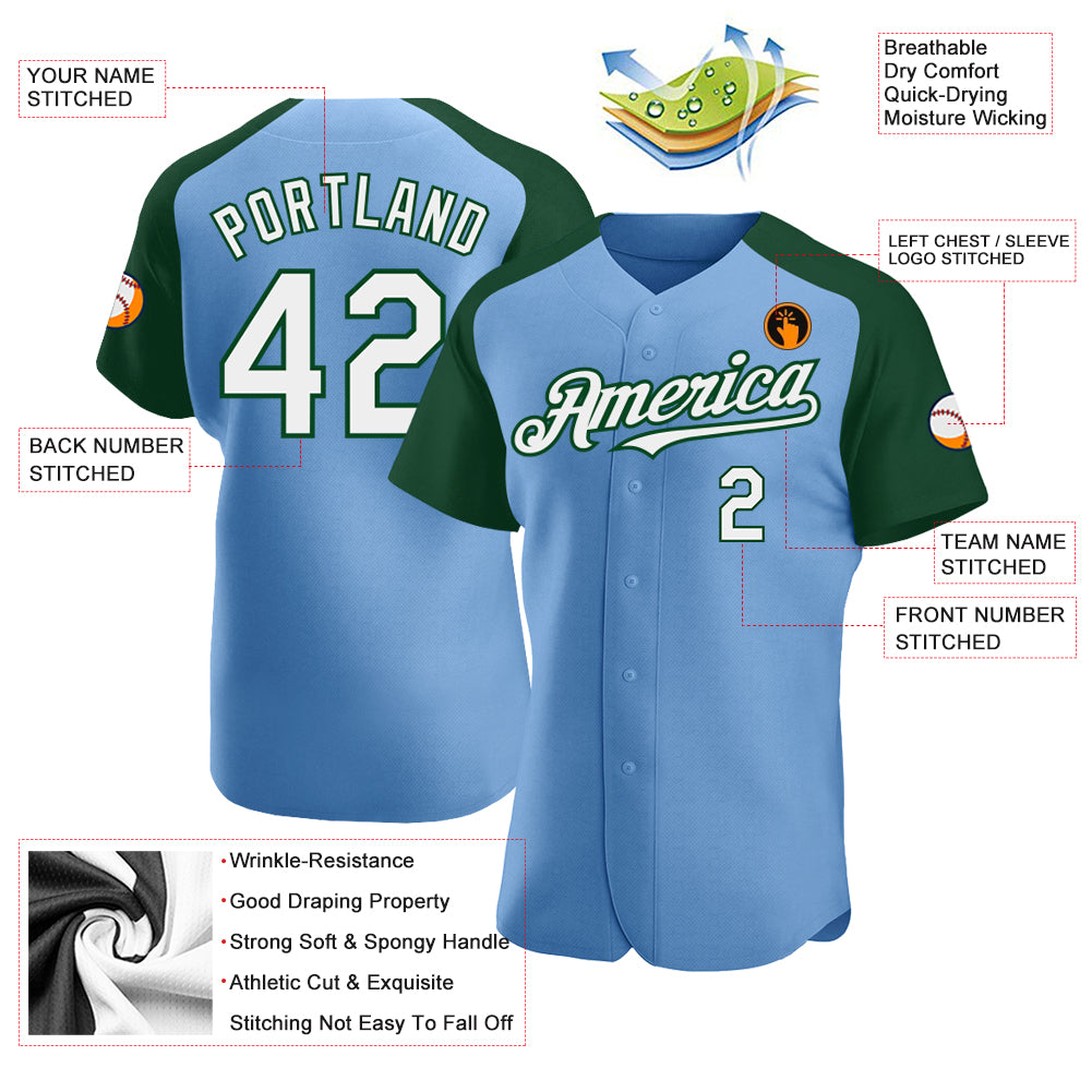 Custom Light Blue White-Green Authentic Raglan Sleeves Baseball Jersey