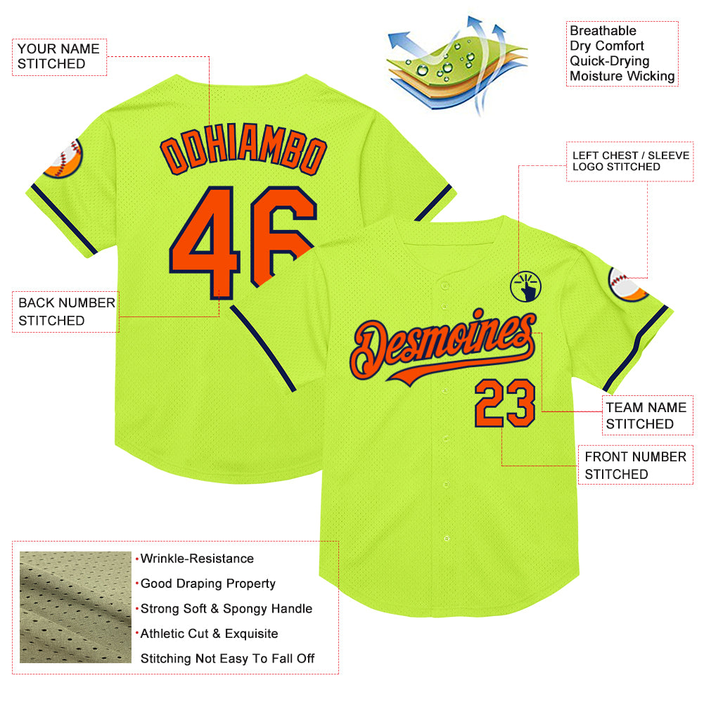 Custom Neon Green Orange-Navy Mesh Authentic Throwback Baseball Jersey