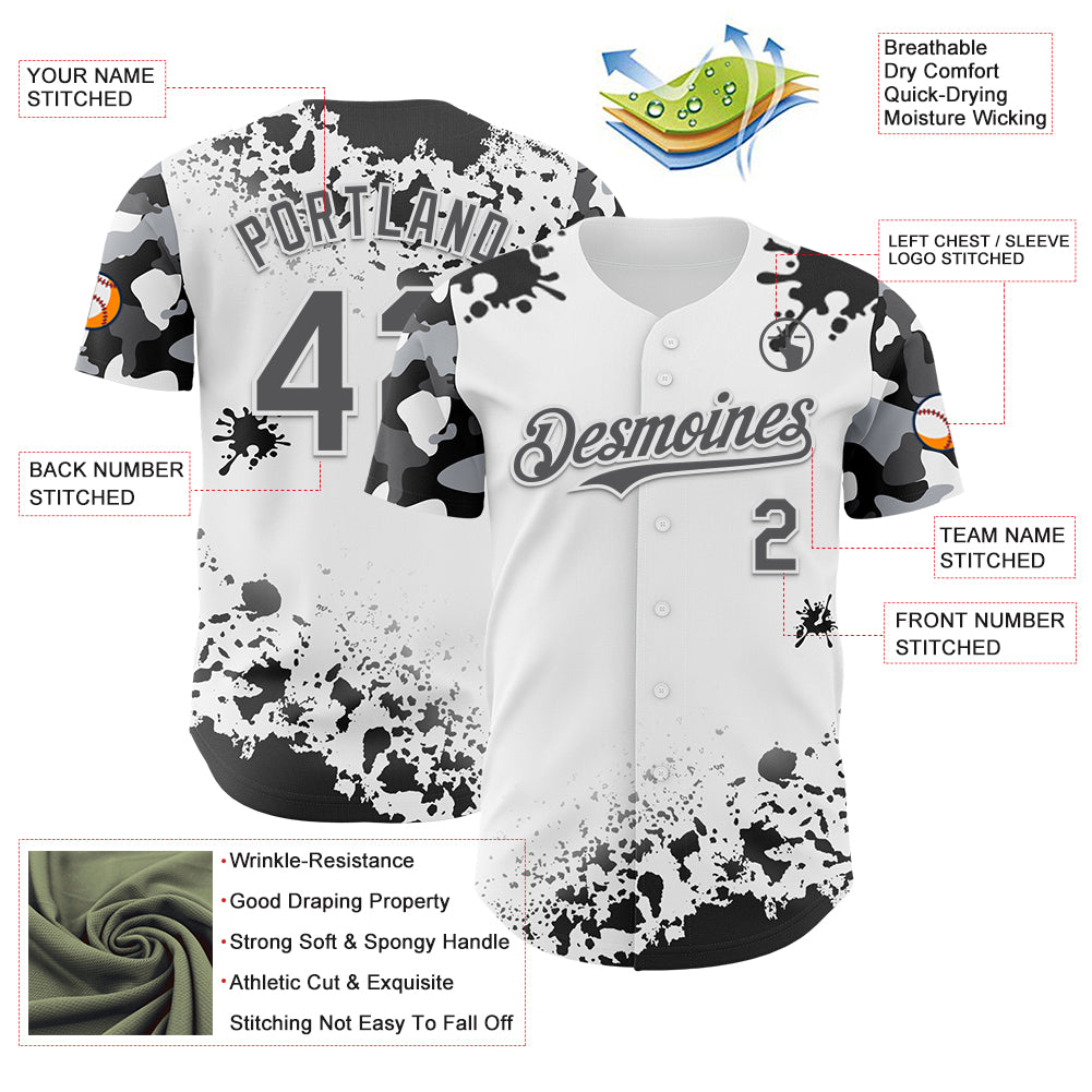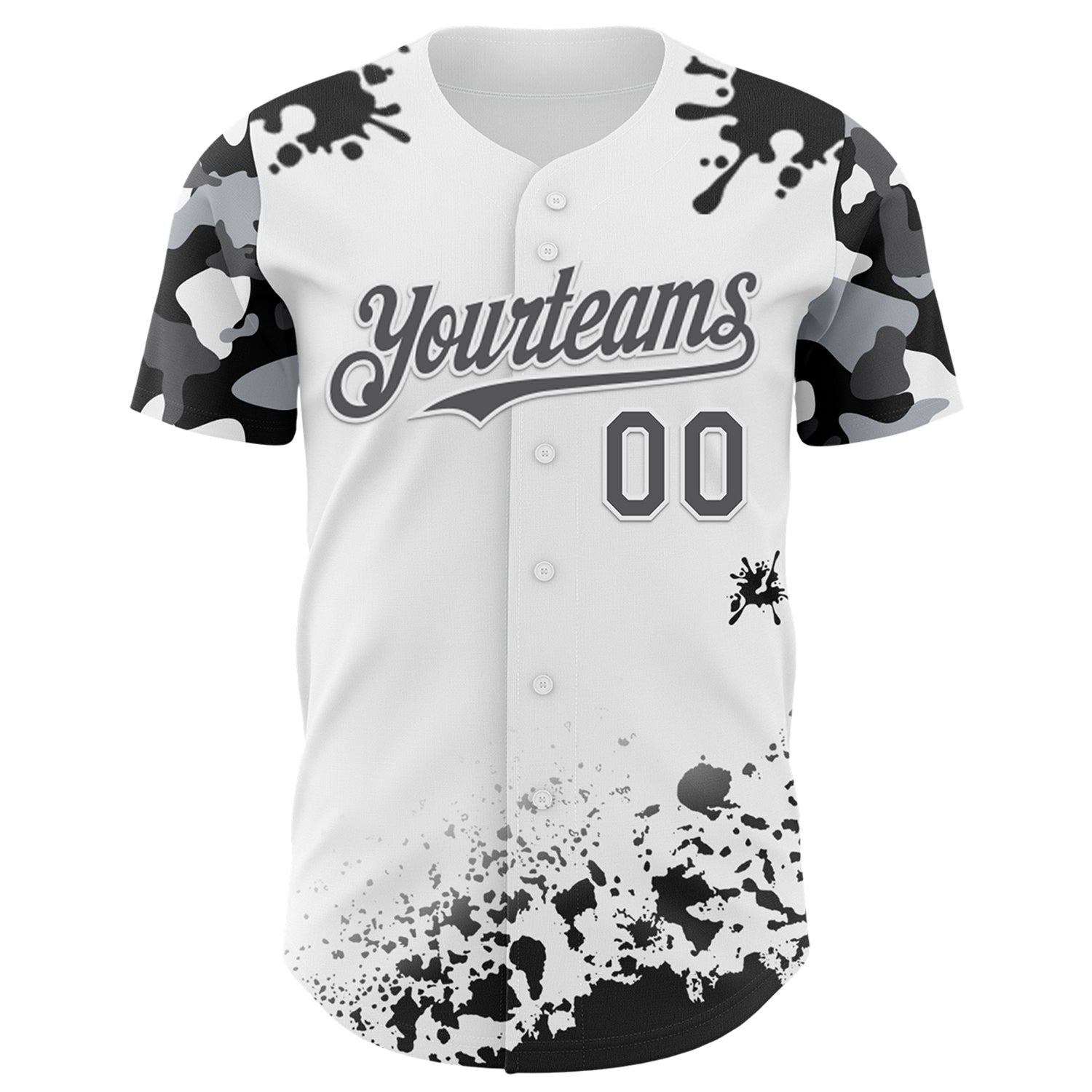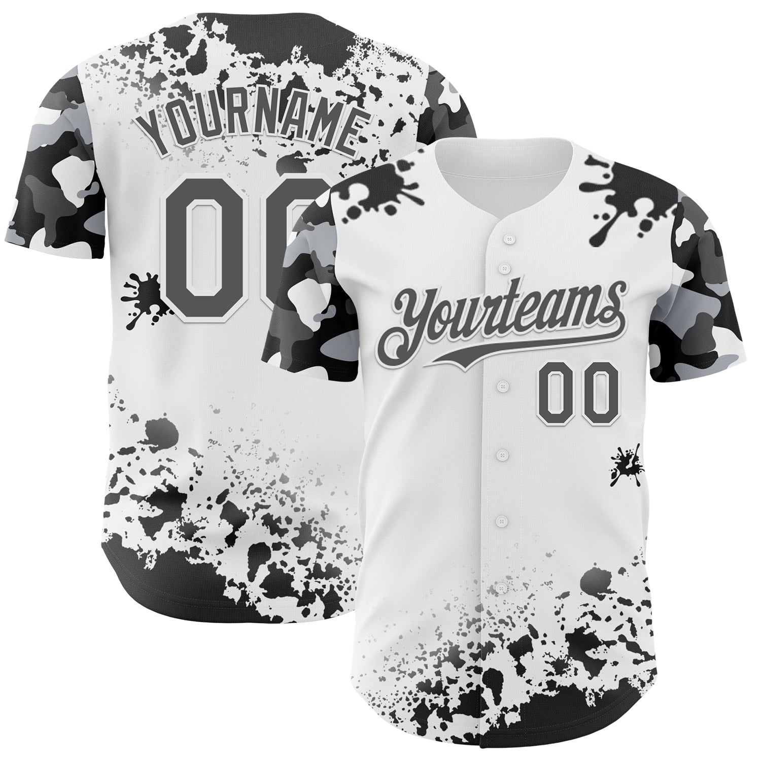 Custom White Steel Gray-Black Splatter Camo Two Tone Authentic Baseball Jersey
