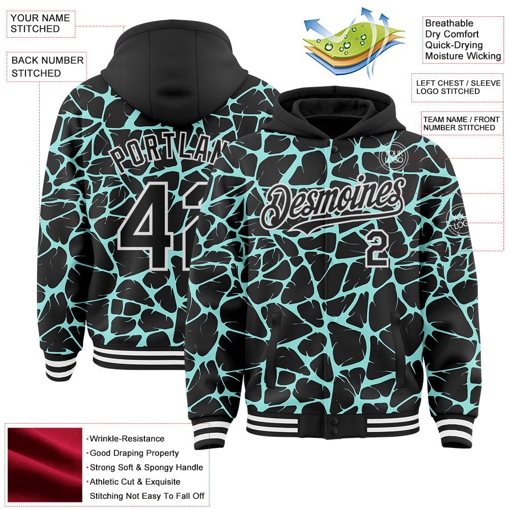 Custom Black Ice Blue-White Abstract Network 3D Pattern Design Bomber Full-Snap Varsity Letterman Hoodie Jacket