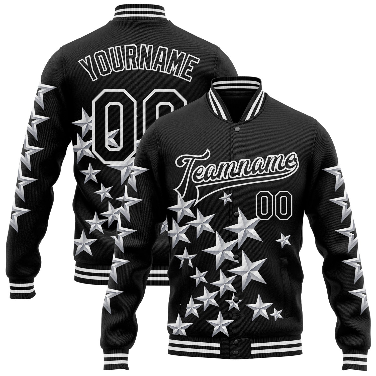 Custom Black White Y2K Stars 3D Pattern Design Bomber Full-Snap Varsity Letterman Jacket