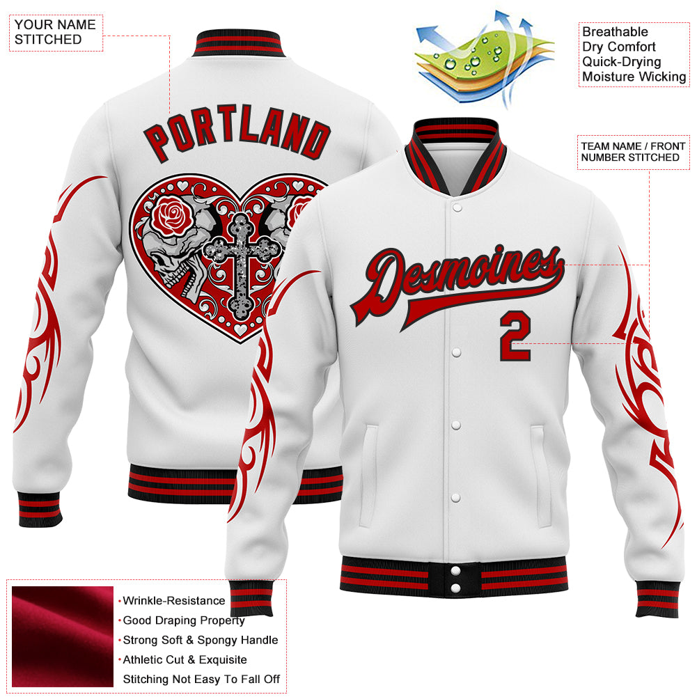 Custom White Red-Black Gothic Skull 3D Pattern Design Bomber Full-Snap Varsity Letterman Jacket
