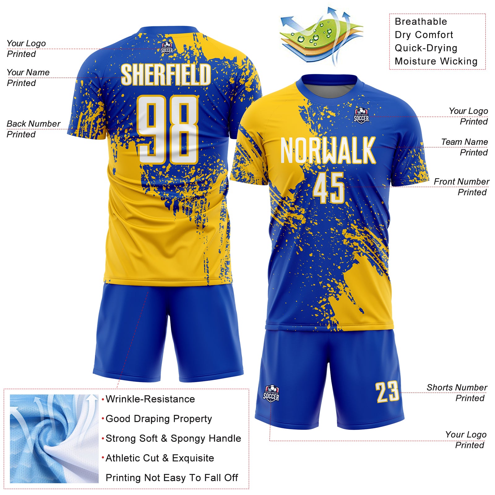Custom Thunder Blue White-Yellow Abstract Brush Stroke Sports Sublimation Soccer Uniform Jersey