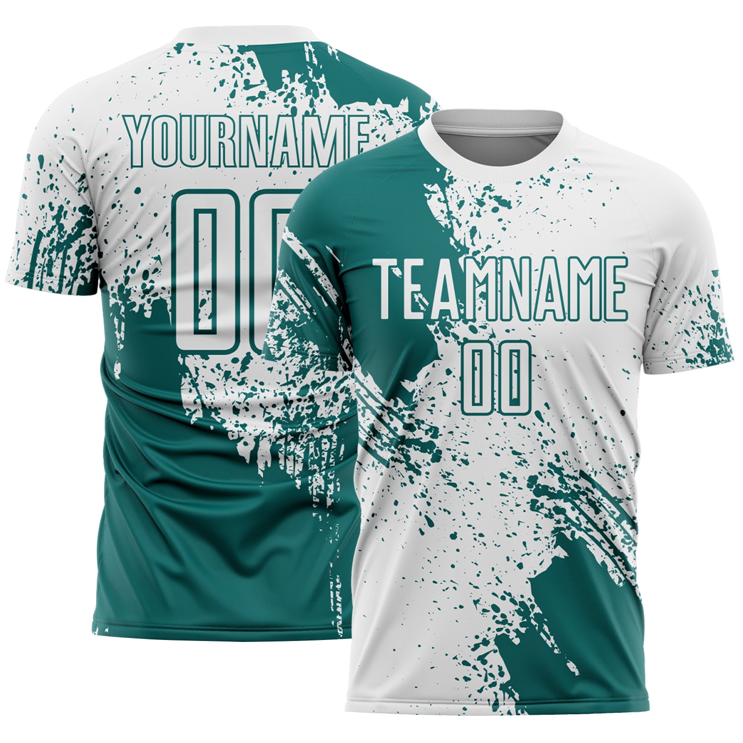 Custom White Teal Abstract Brush Stroke Sports Sublimation Soccer Uniform Jersey