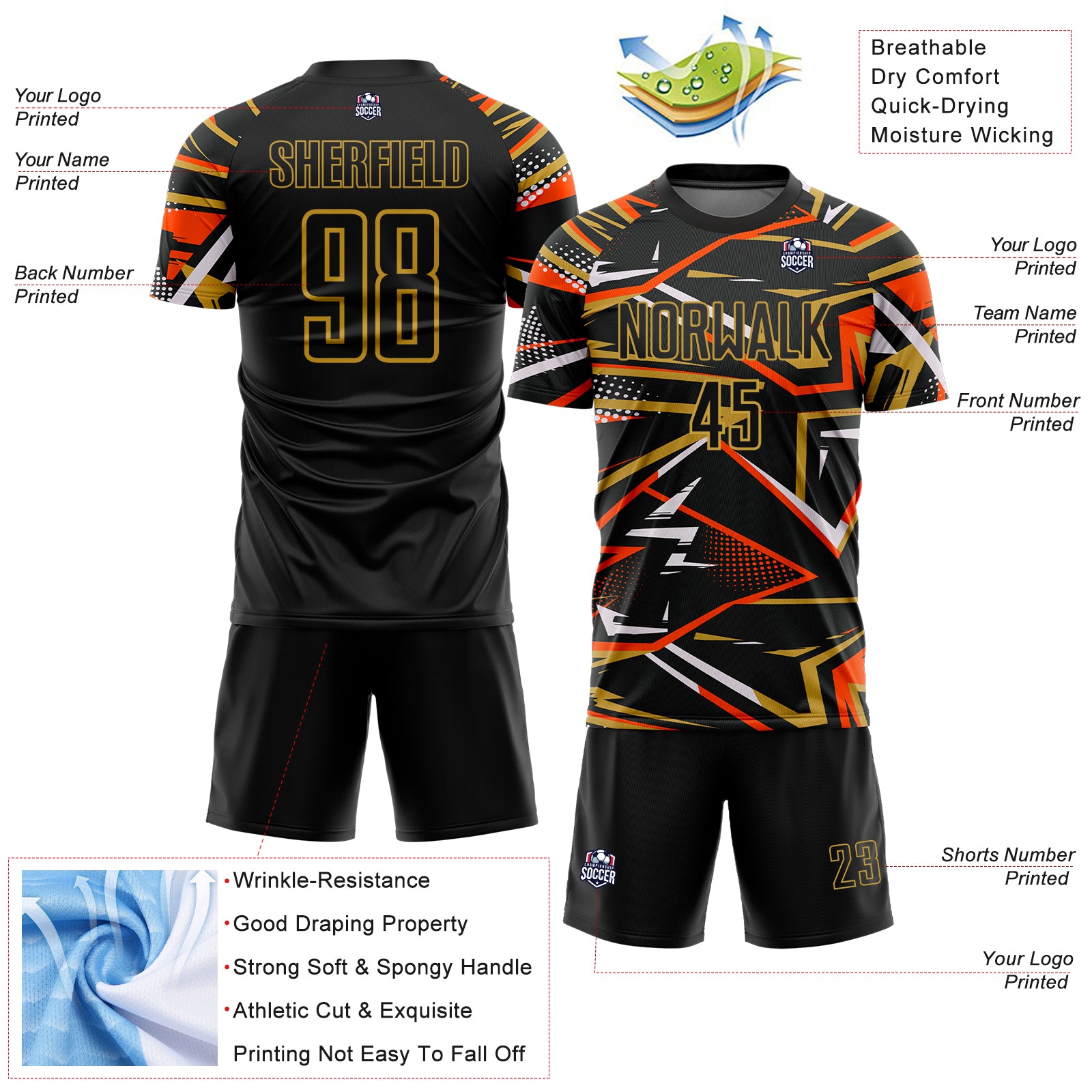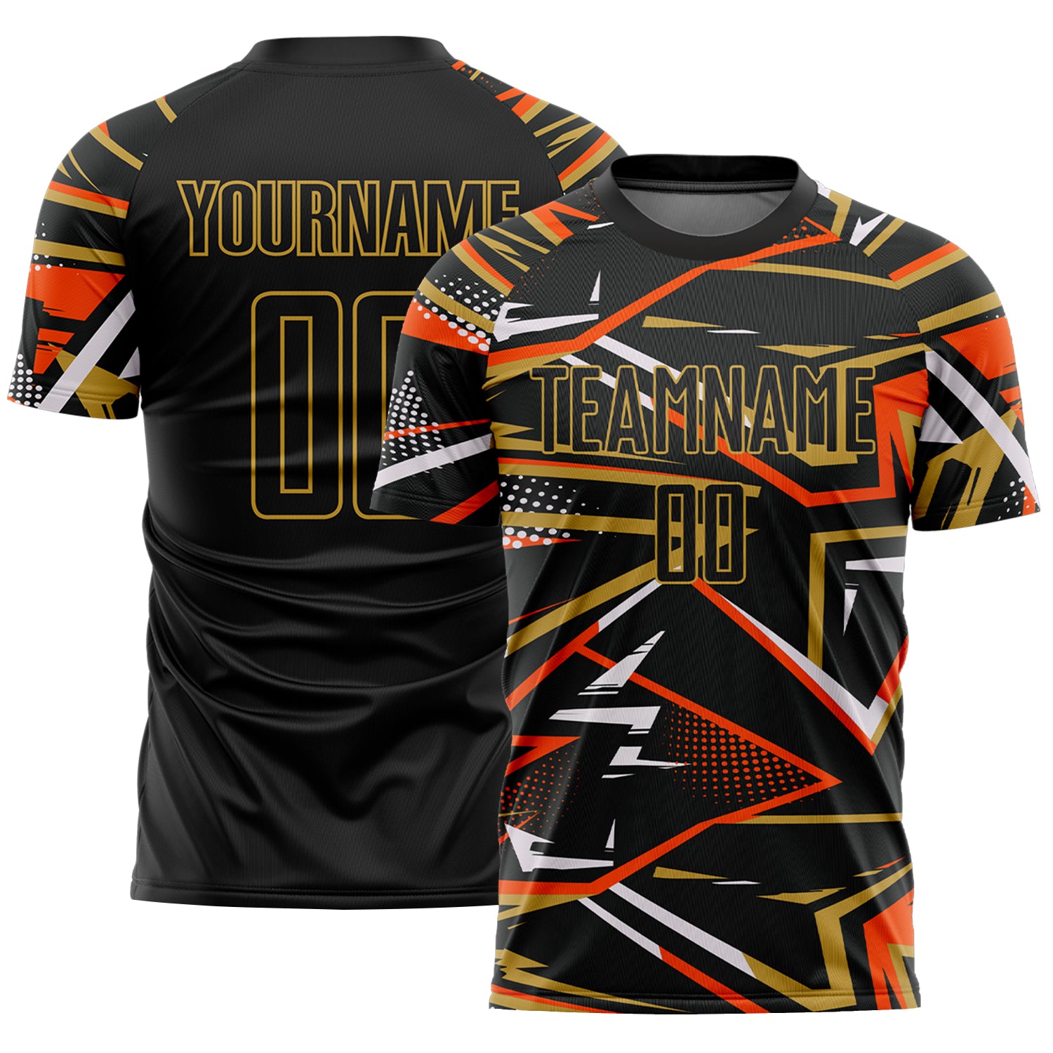 Custom Black Orange Old Gold-White Abstract Geometric Stripes Sports Sublimation Soccer Uniform Jersey
