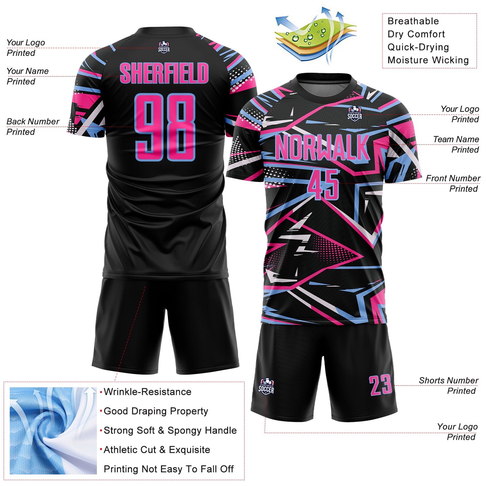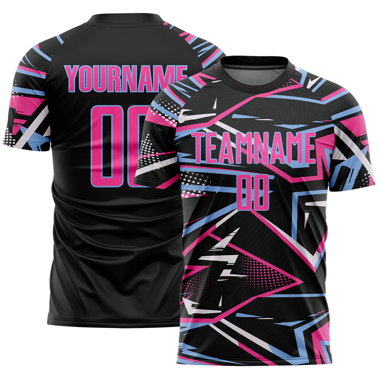 Custom Black Pink Light Blue-White Abstract Geometric Stripes Sports Sublimation Soccer Uniform Jersey