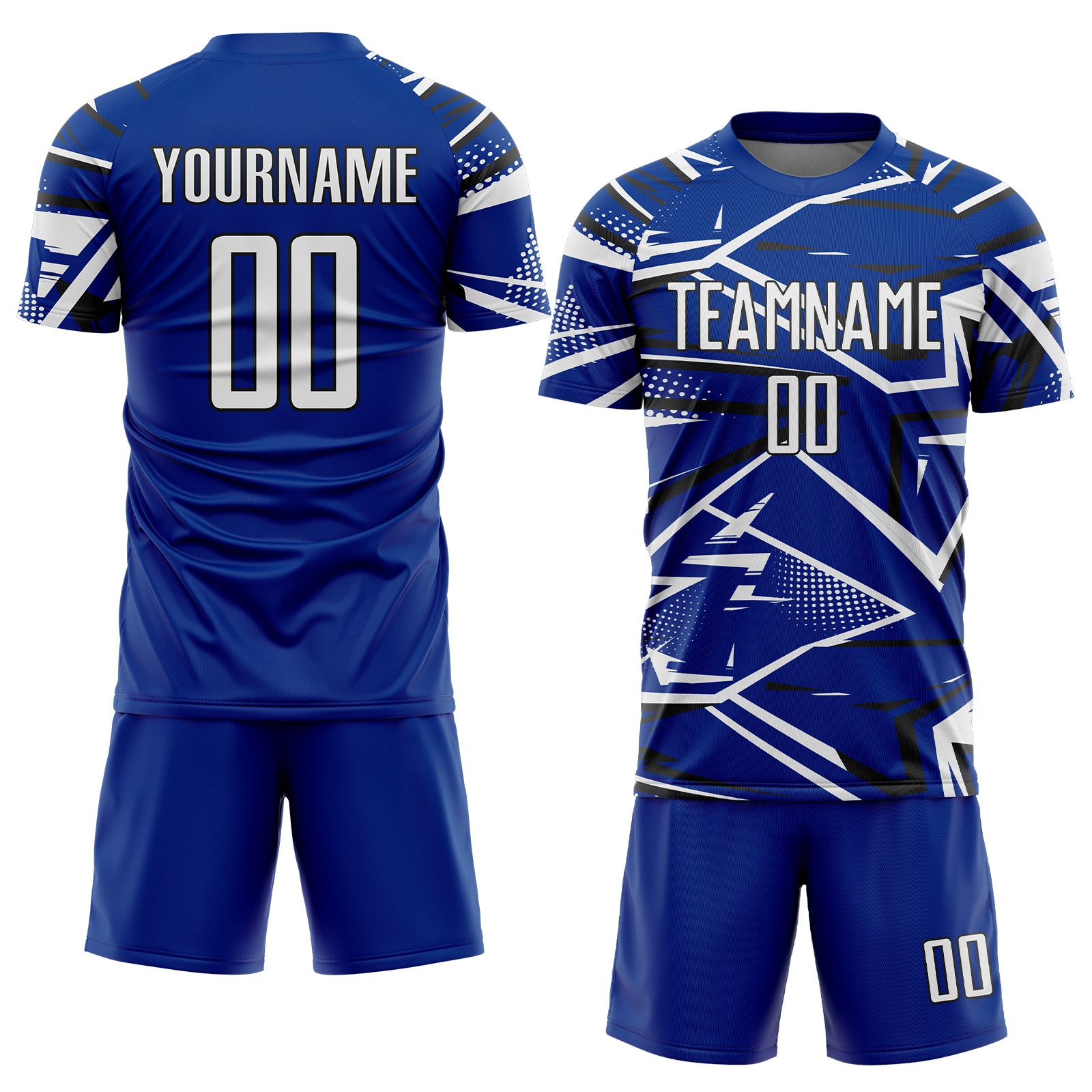 Custom Royal White-Black Abstract Geometric Stripes Sports Sublimation Soccer Uniform Jersey