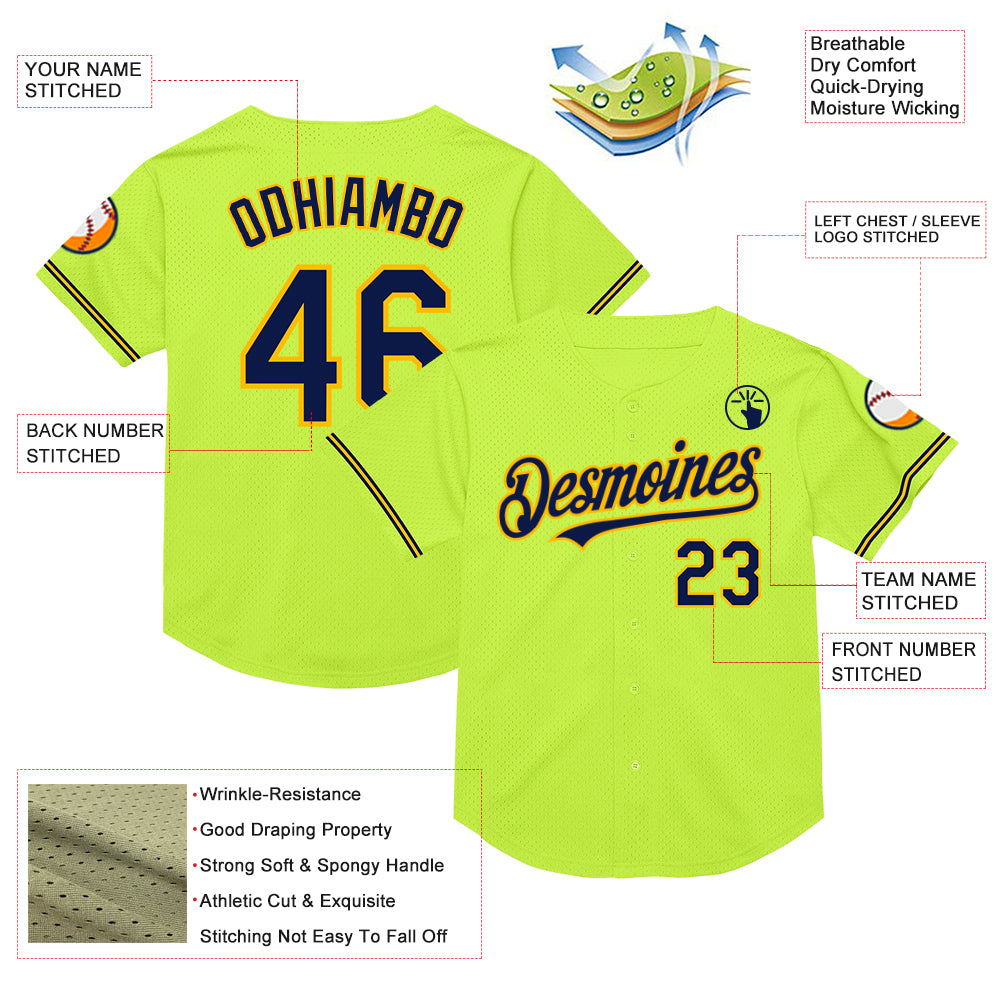Custom Neon Green Navy-Gold Mesh Authentic Throwback Baseball Jersey