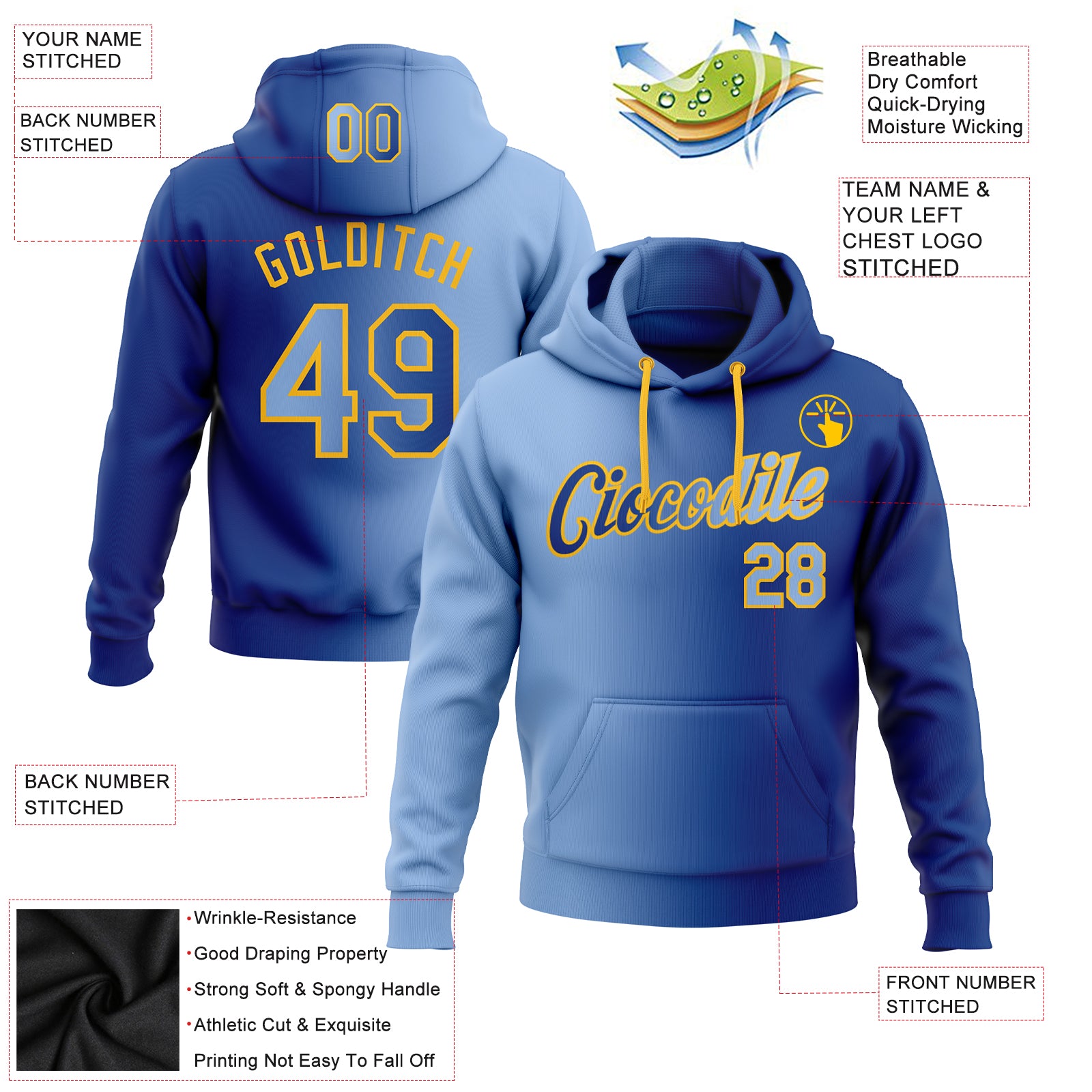 Custom Stitched Royal Light Blue-Gold Gradient Fashion Sports Pullover Sweatshirt Hoodie