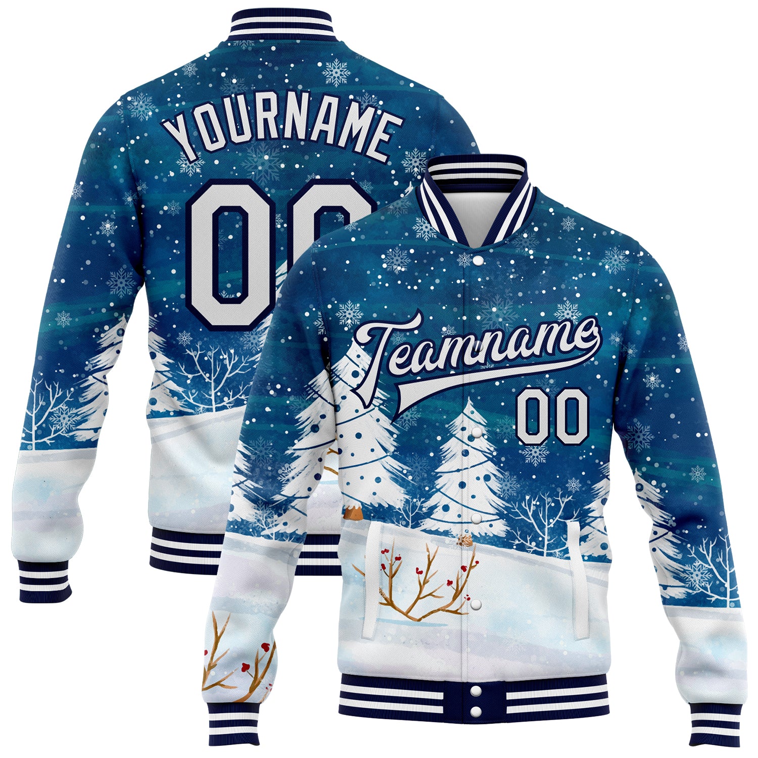 Custom Royal White-Navy Watercolor Winter Landscape With Snowy Trees 3D Pattern Design Bomber Full-Snap Varsity Letterman Jacket