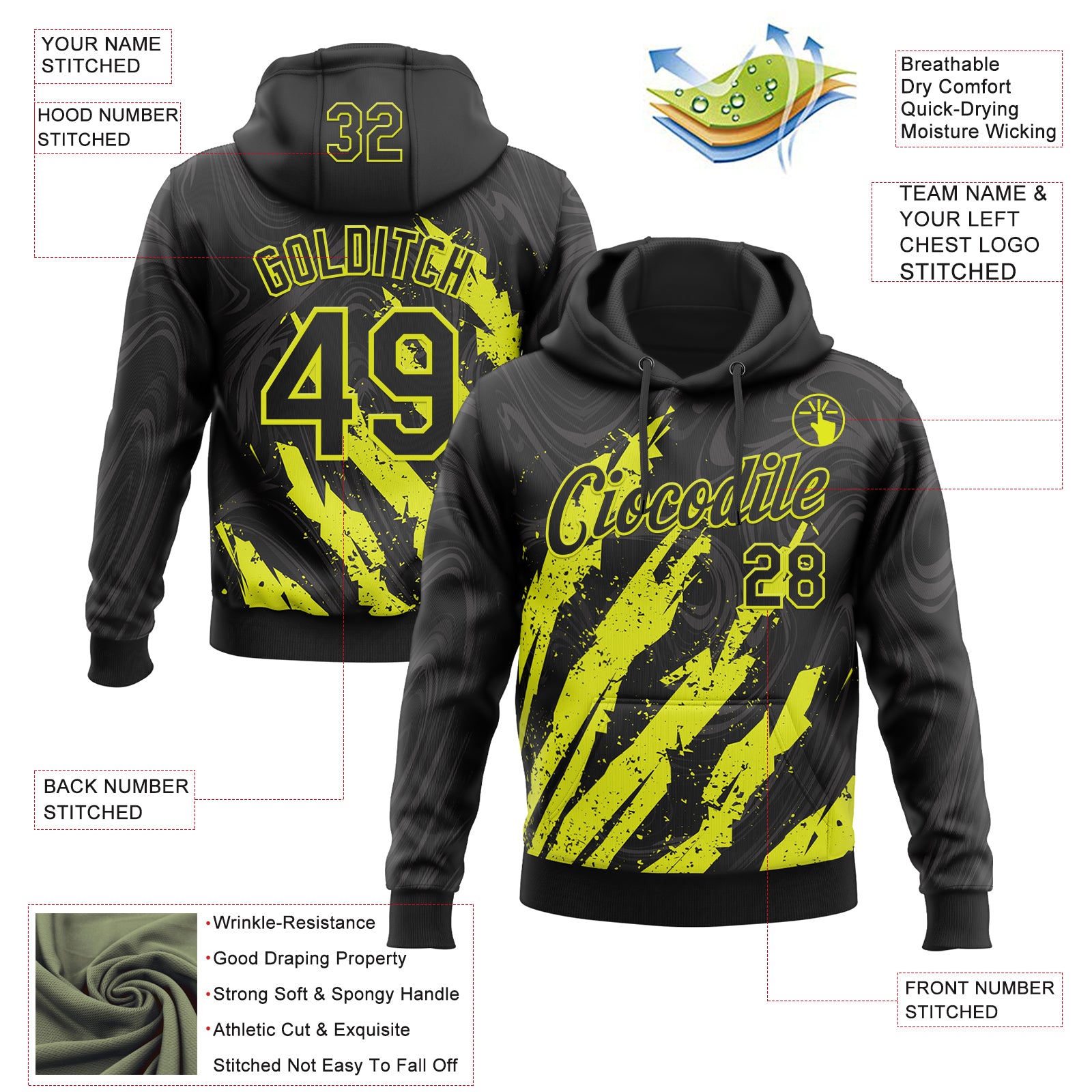 Custom Stitched Black Neon Yellow 3D Pattern Design Splash Sports Pullover Sweatshirt Hoodie