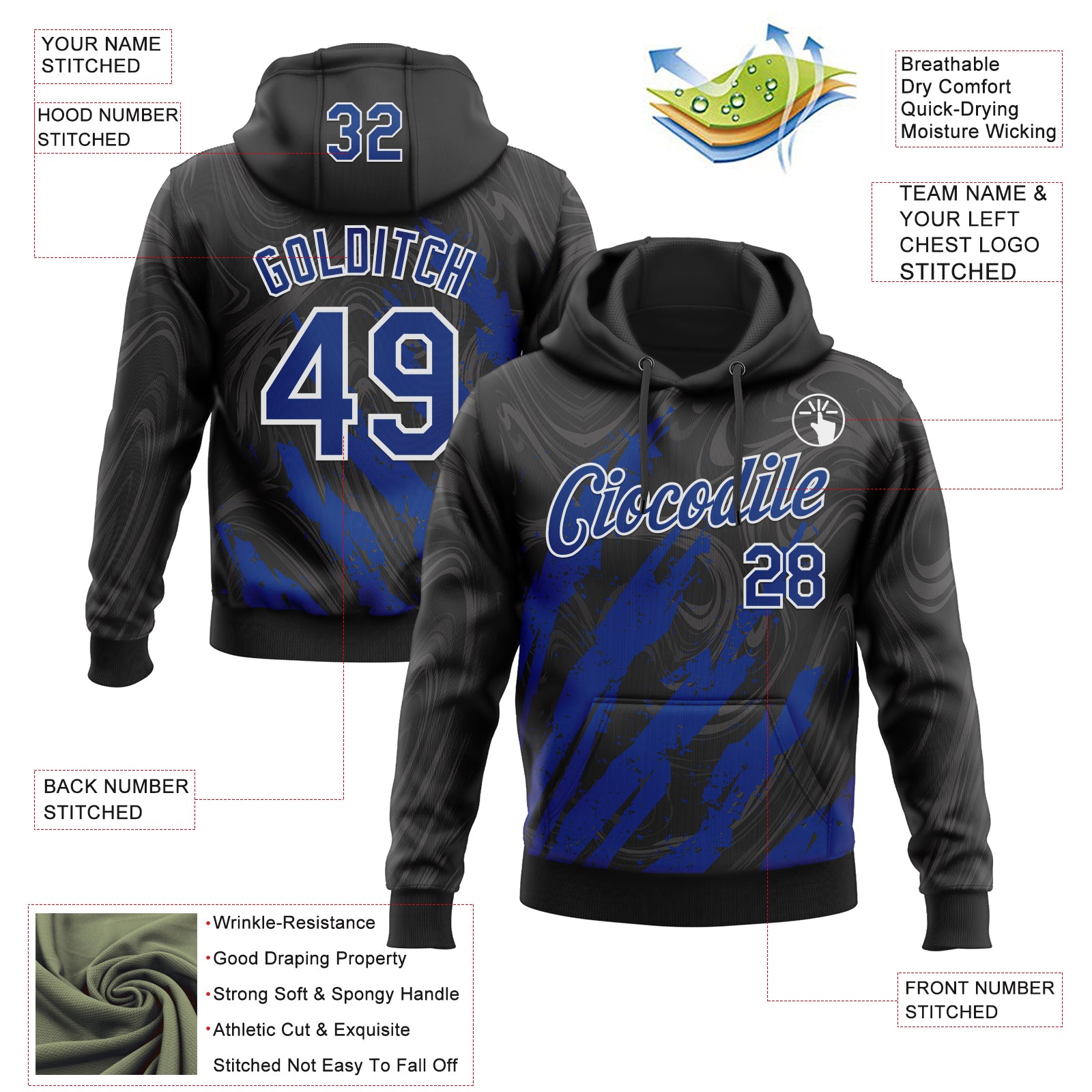 Custom Stitched Black Royal-White 3D Pattern Design Splash Sports Pullover Sweatshirt Hoodie