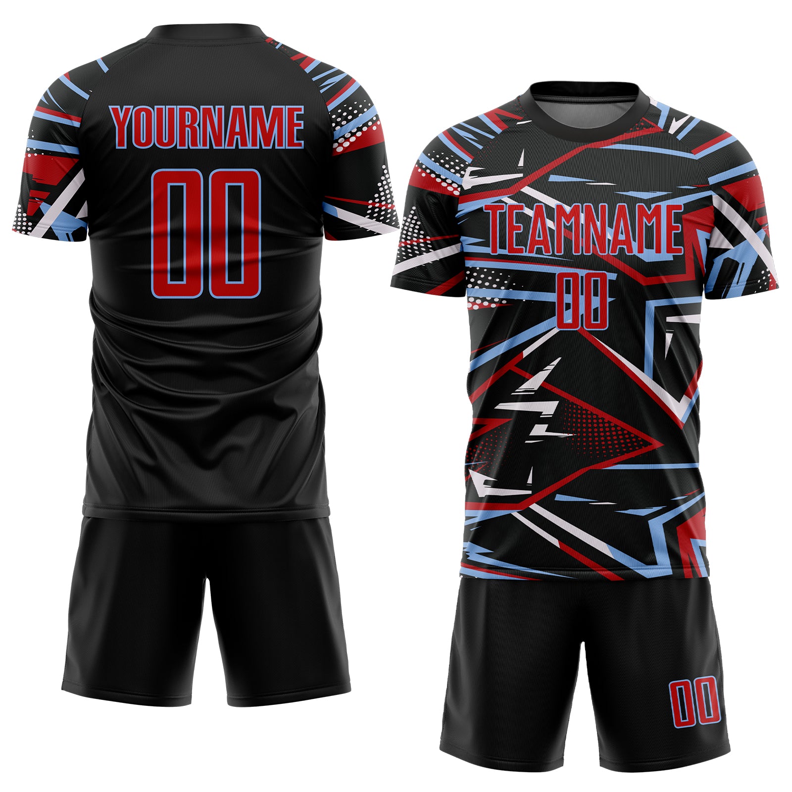 Custom Black Red Light Blue-White Abstract Geometric Stripes Sports Sublimation Soccer Uniform Jersey