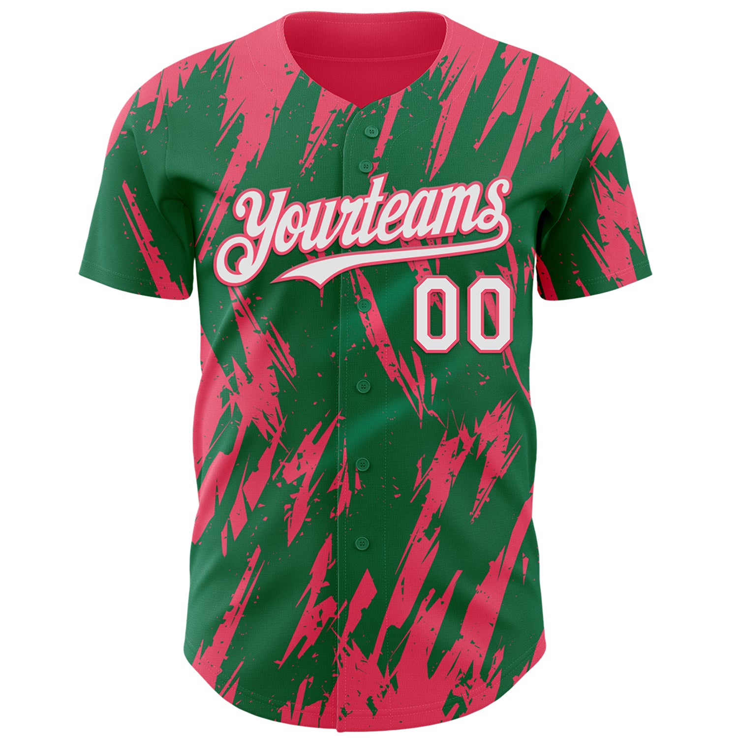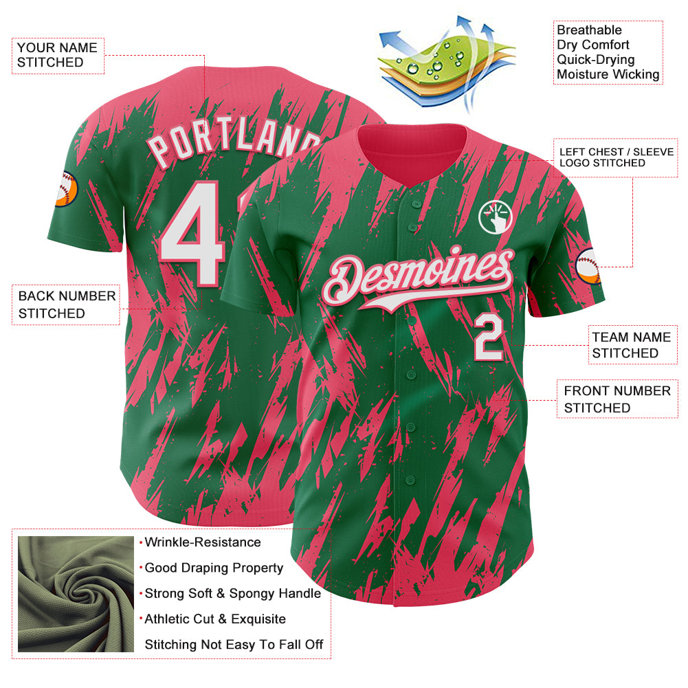 Custom Kelly Green White-Neon Pink 3D Pattern Design Splatter Torn Sharp Brush Stroke Authentic Baseball Jersey