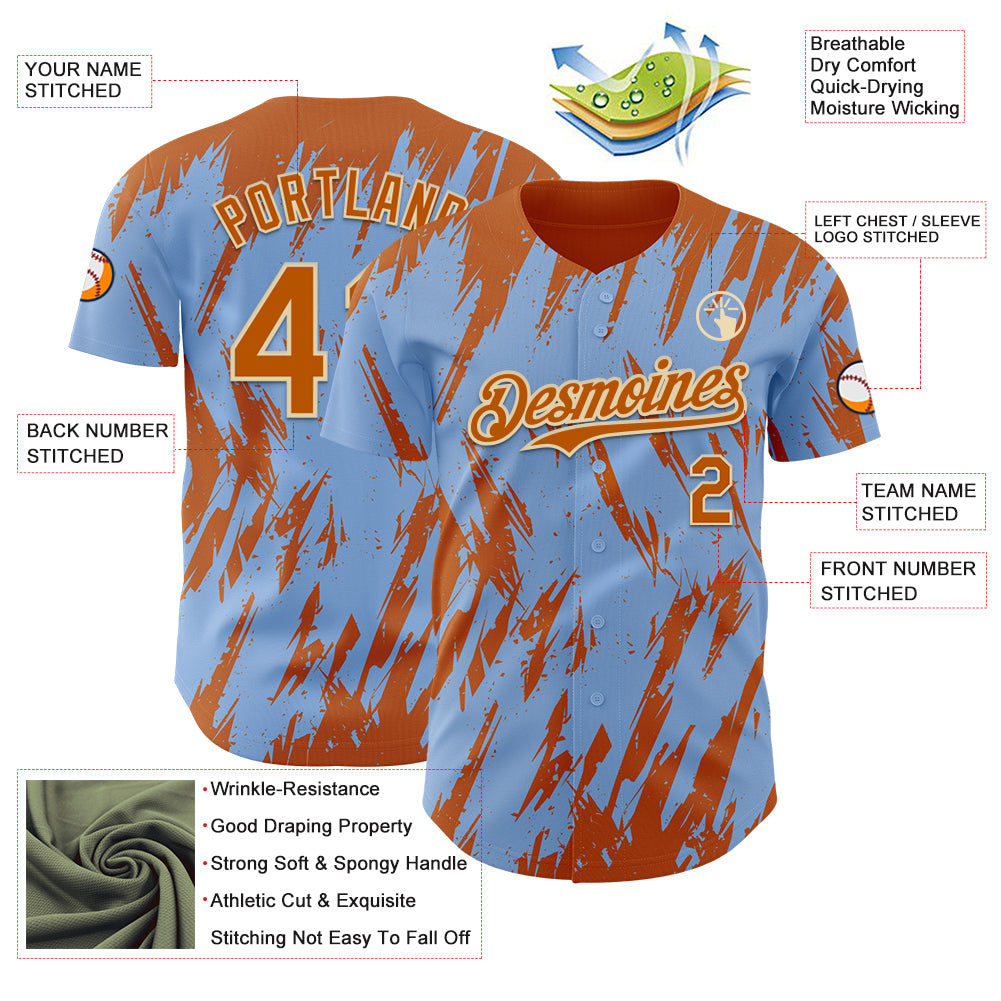 Custom Light Blue Bay Orange-Cream 3D Pattern Design Splatter Torn Sharp Brush Stroke Authentic Baseball Jersey