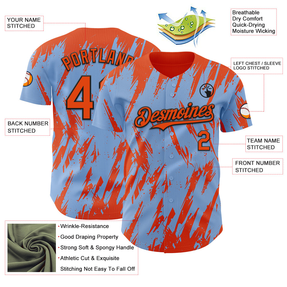 Custom Light Blue Orange-Black 3D Pattern Design Splatter Torn Sharp Brush Stroke Authentic Baseball Jersey