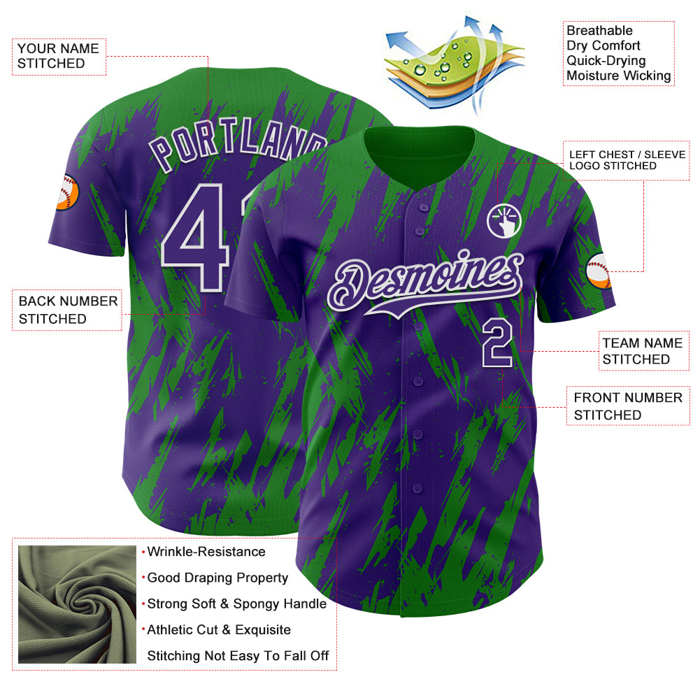 Custom Purple White-Grass Green 3D Pattern Design Splatter Torn Sharp Brush Stroke Authentic Baseball Jersey