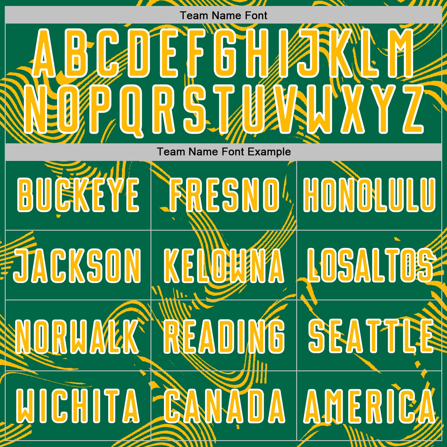 Custom Kelly Green Gold-White Curve Lines Sports Sublimation Soccer Uniform Jersey