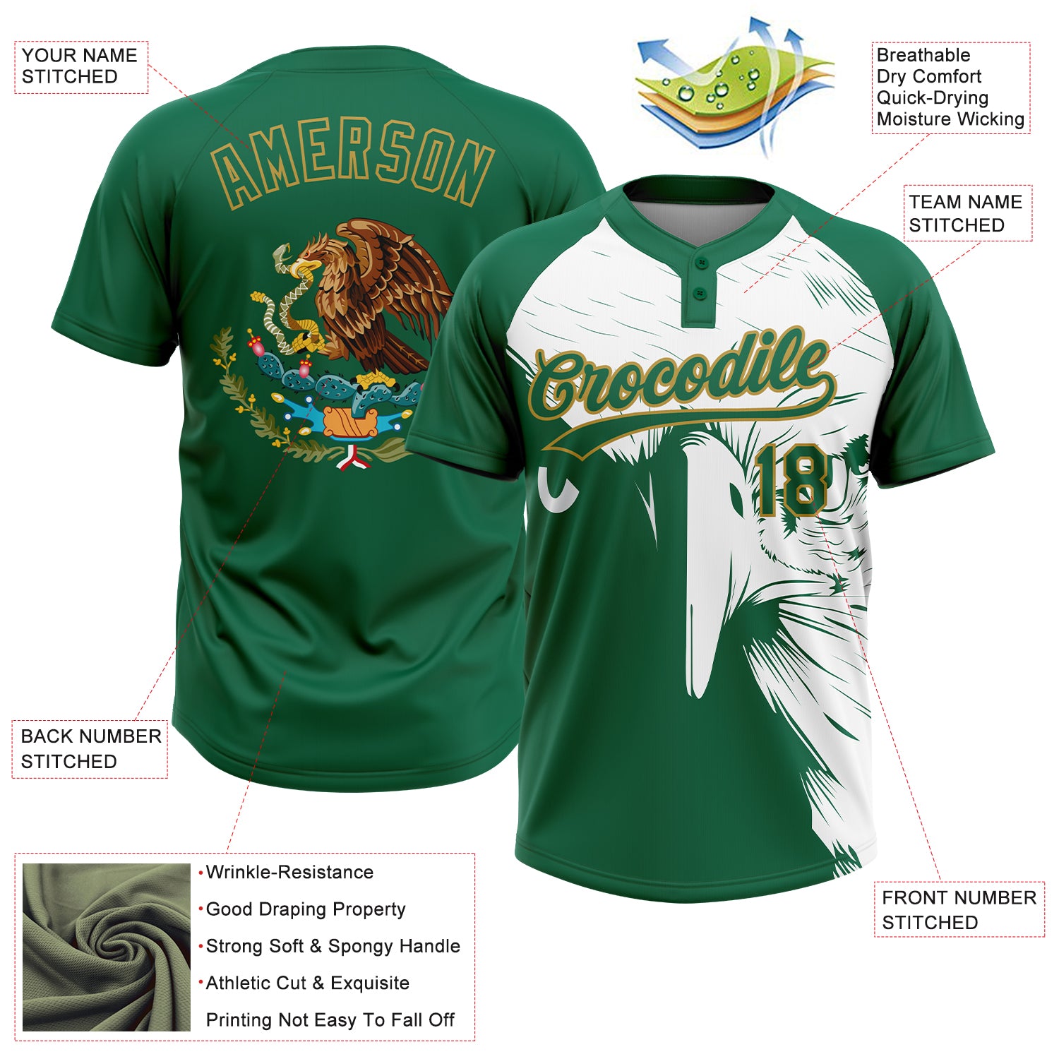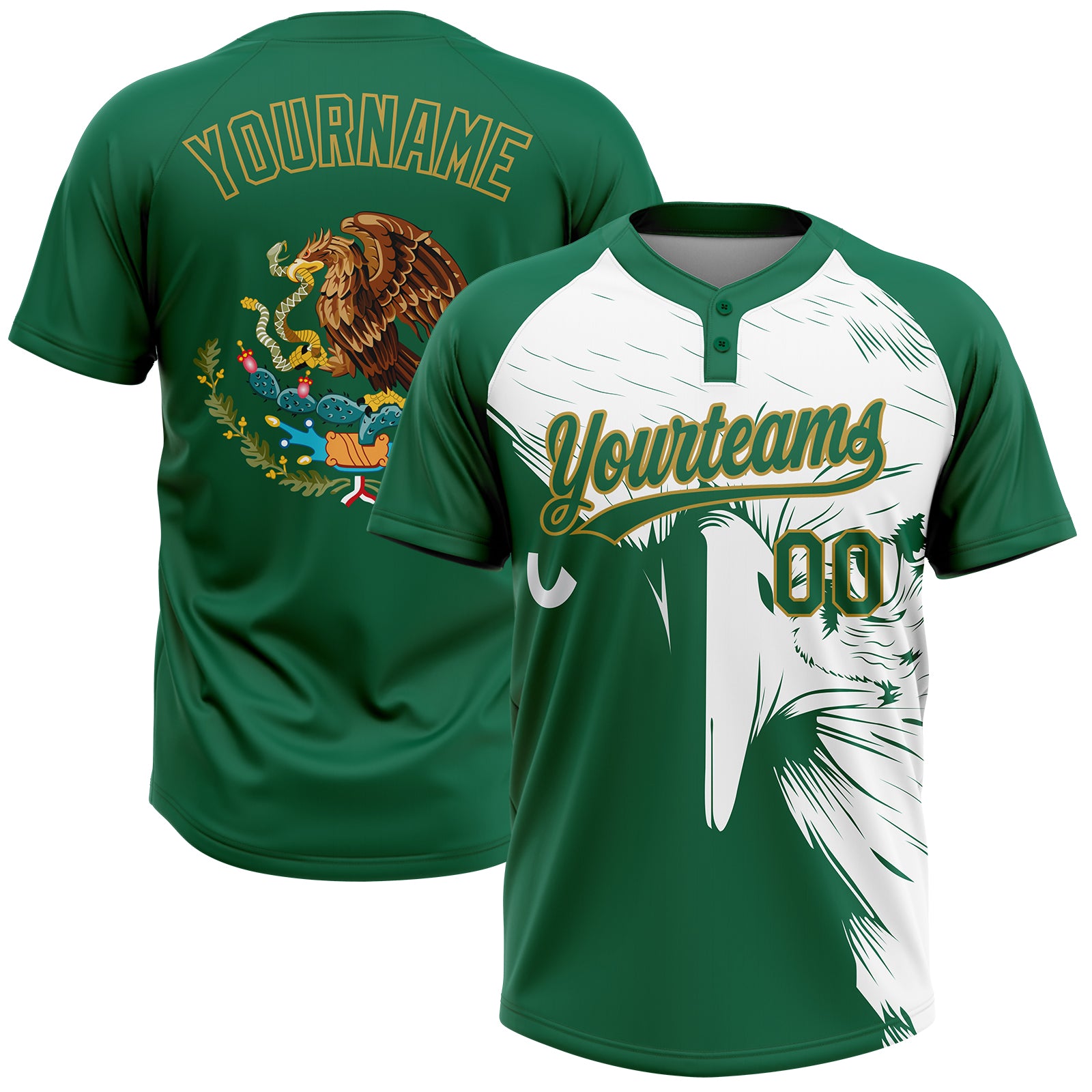 Custom Kelly Green Old Gold-White Mexico Two-Button Unisex Softball Jersey
