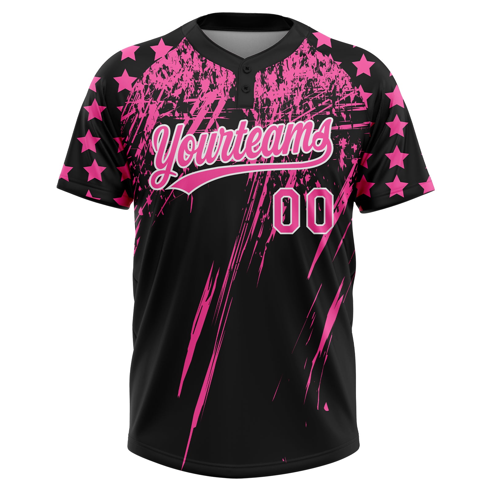 Custom Black Pink-White Distressed Scratch Brush Stroke Star Raglan Sleeves Two-Button Unisex Softball Jersey