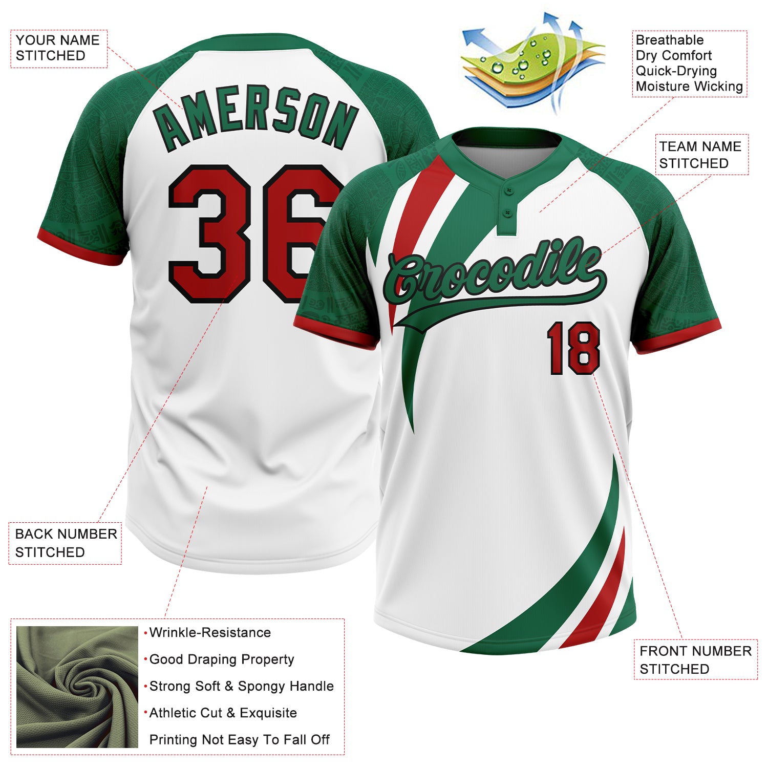 Custom White Red Kelly Green-Black Mexico Two-Button Unisex Softball Jersey