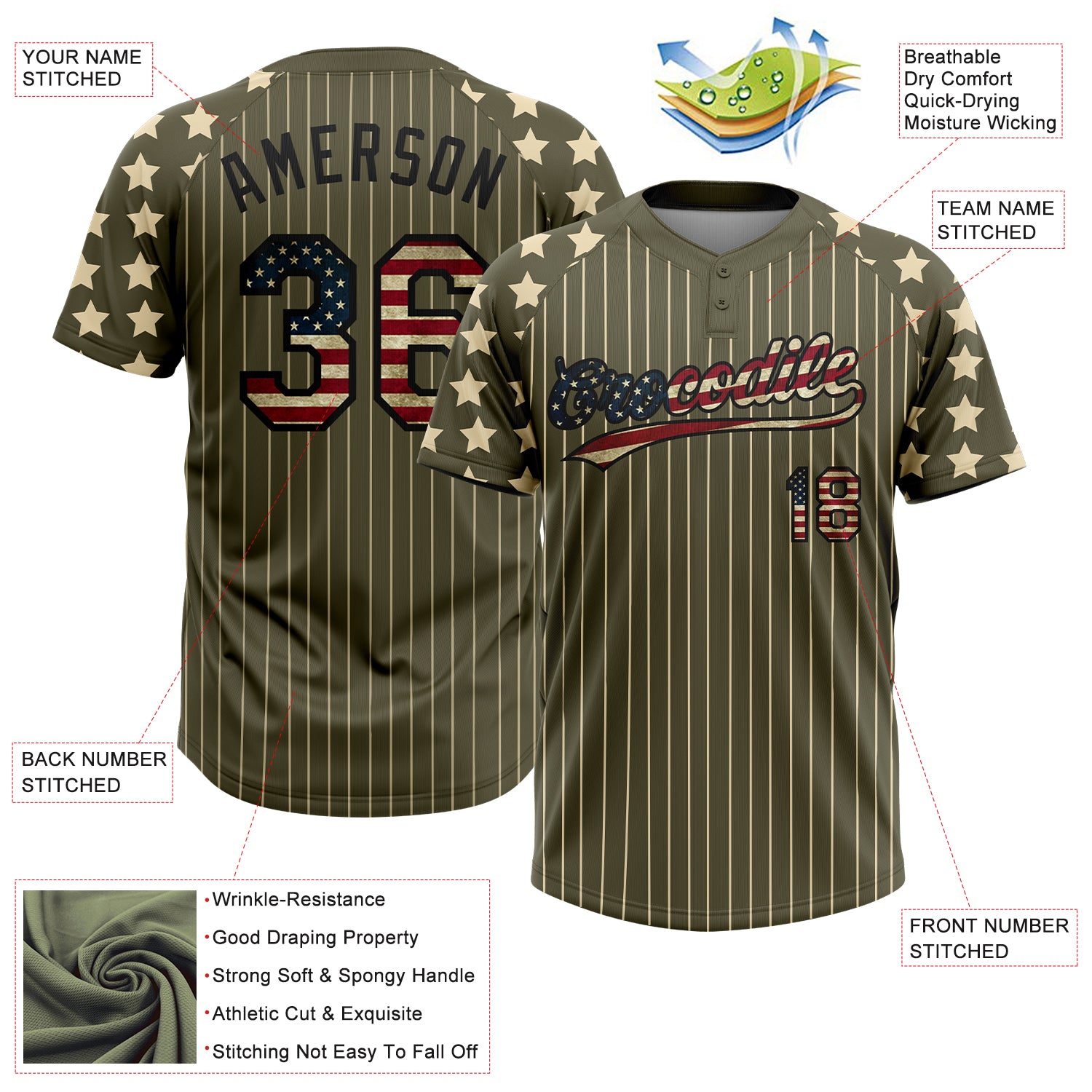Custom Olive Cream Pinstripe Vintage USA Flag-Black Salute To Service Star Raglan Sleeves Two-Button Unisex Softball Jersey