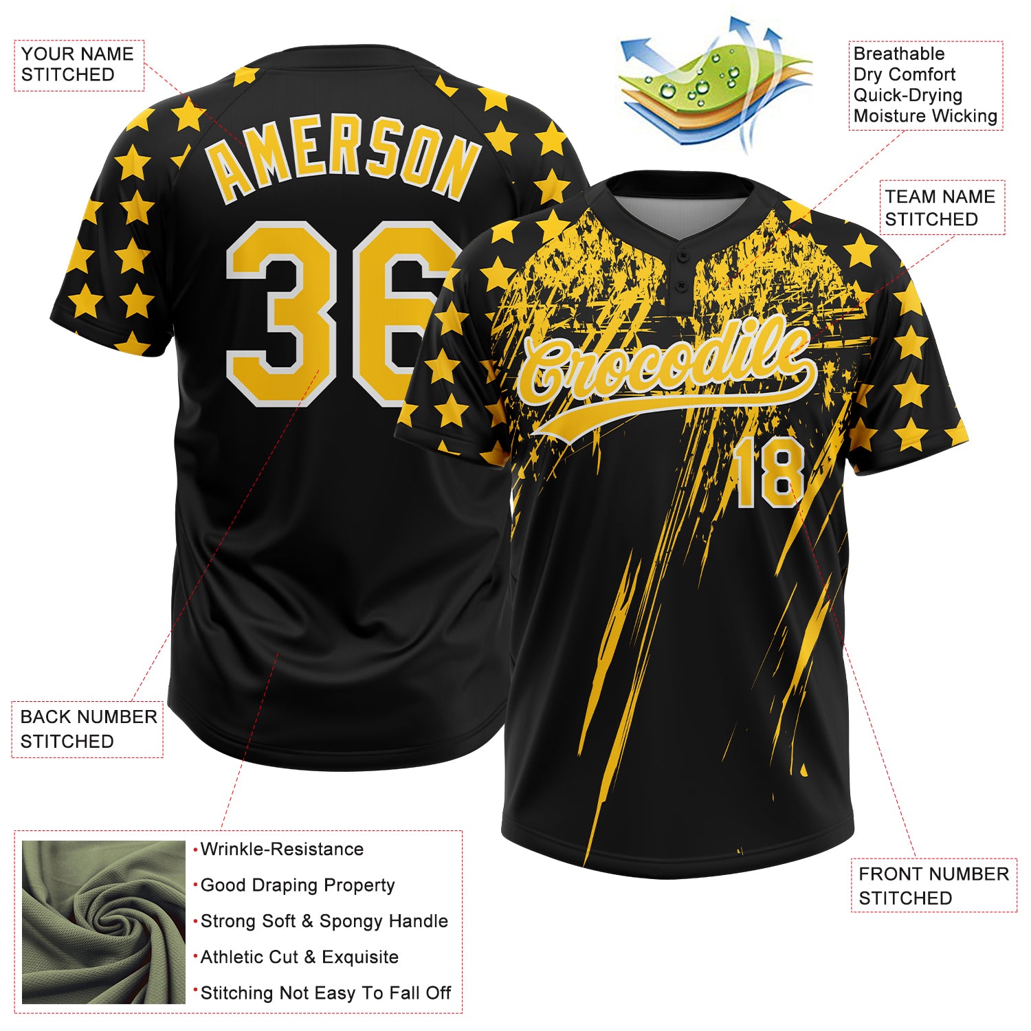 Custom Black Yellow-White Distressed Scratch Brush Stroke Star Raglan Sleeves Two-Button Unisex Softball Jersey
