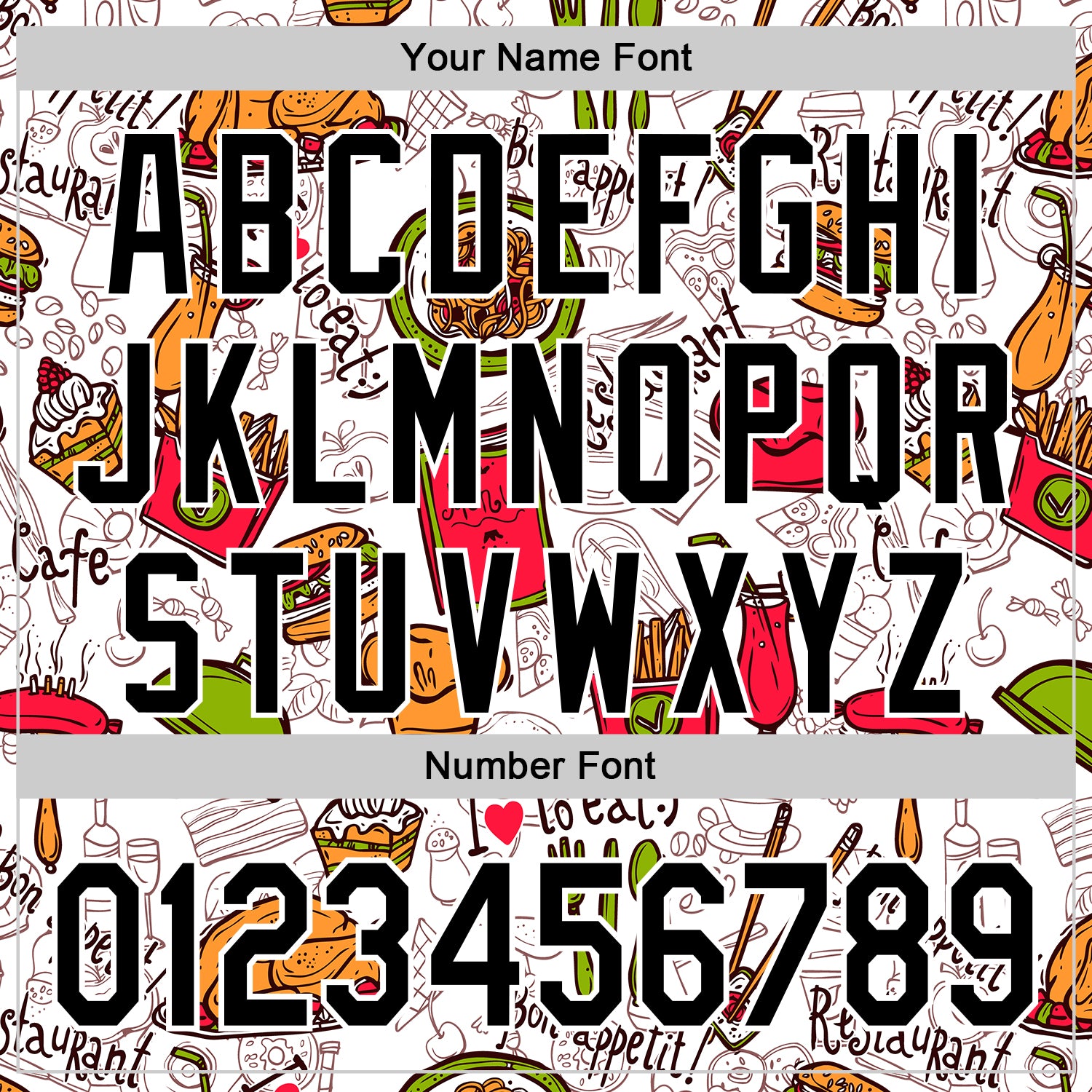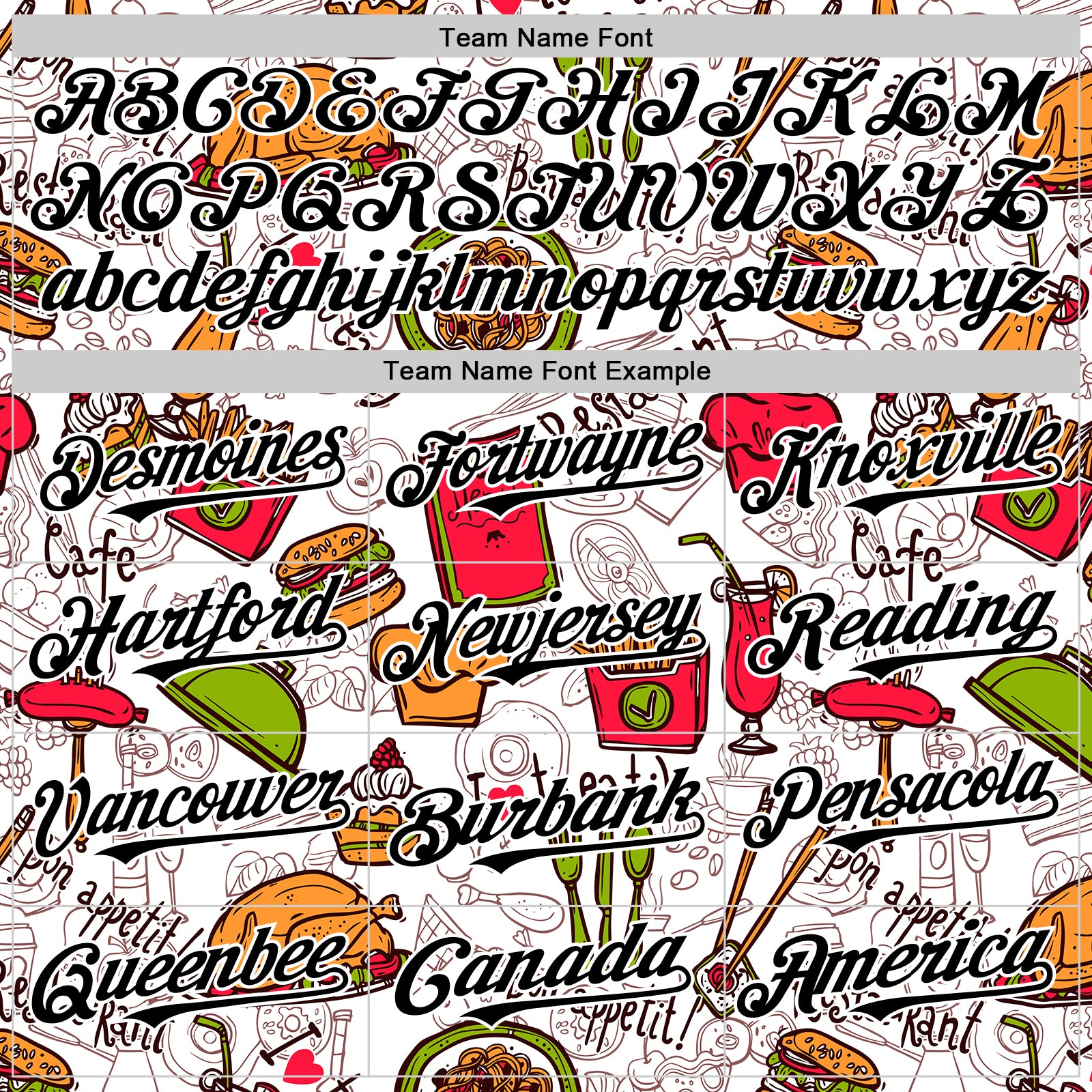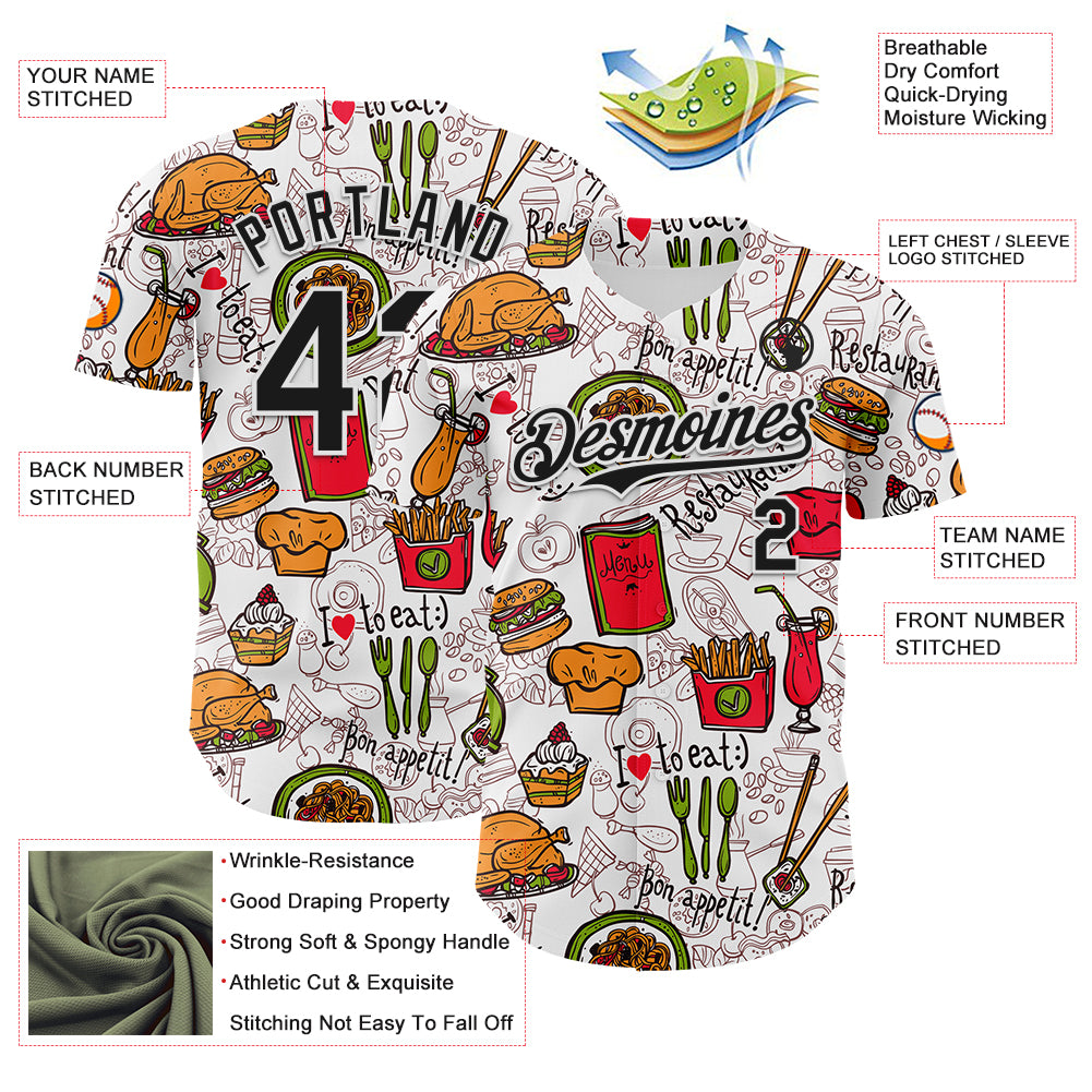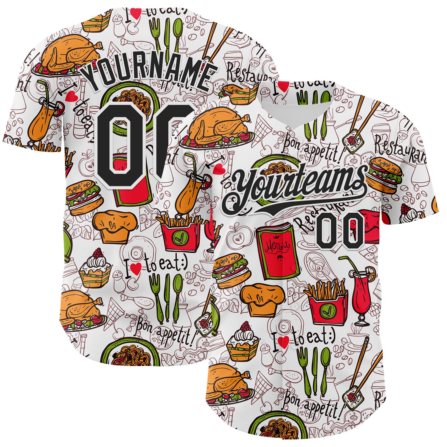 Custom White Black 3D Pattern Design Foodie Fast Food Doodles Authentic Baseball Jersey